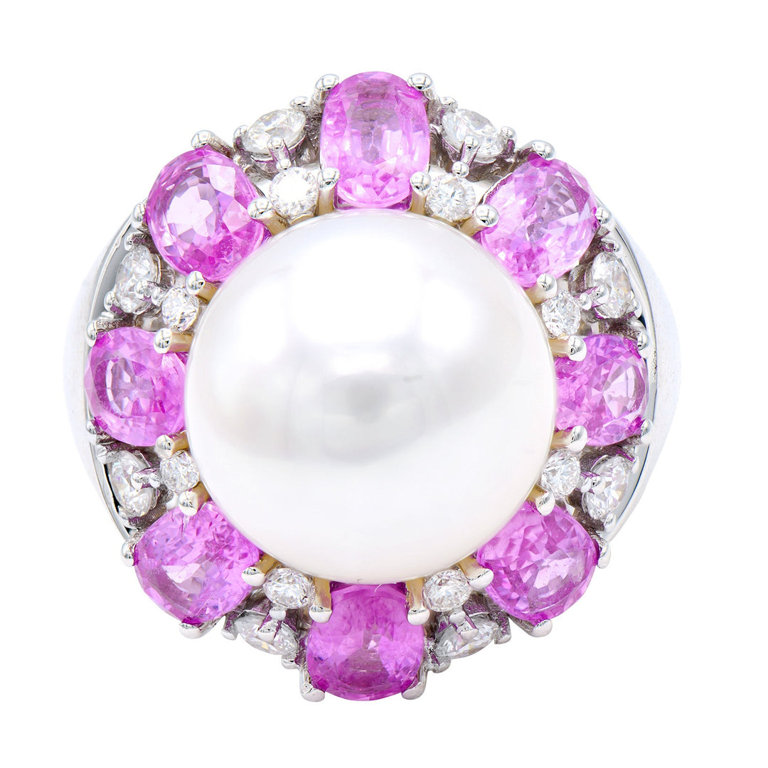 18kt white gold south sea pearl, pink sapphire, and diamond cocktail ring