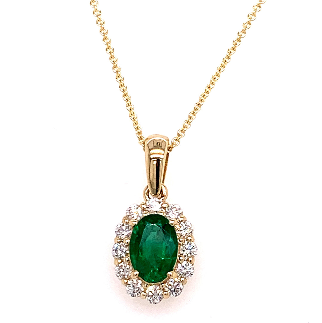 14kt yellow gold oval emerald and diamond halo pendant necklace