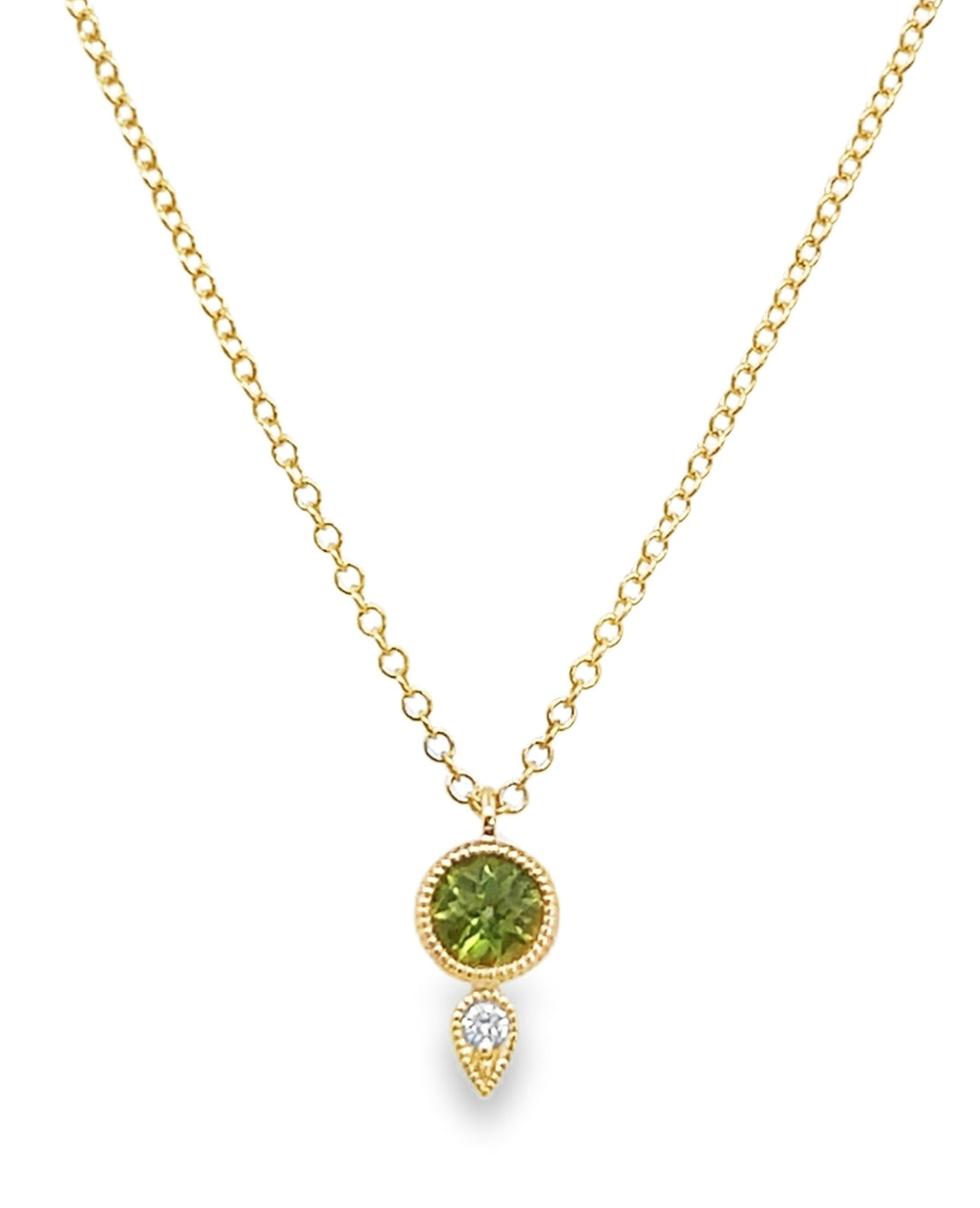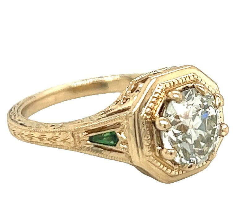 14kt yellow gold Old European Cut diamond engagement ring with tsavorite garnet accents