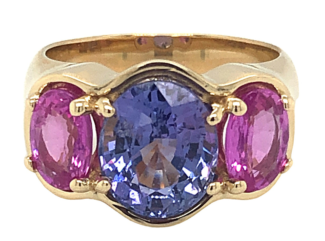 14kt yellow gold oval purple and pink sapphires three-stone ring
