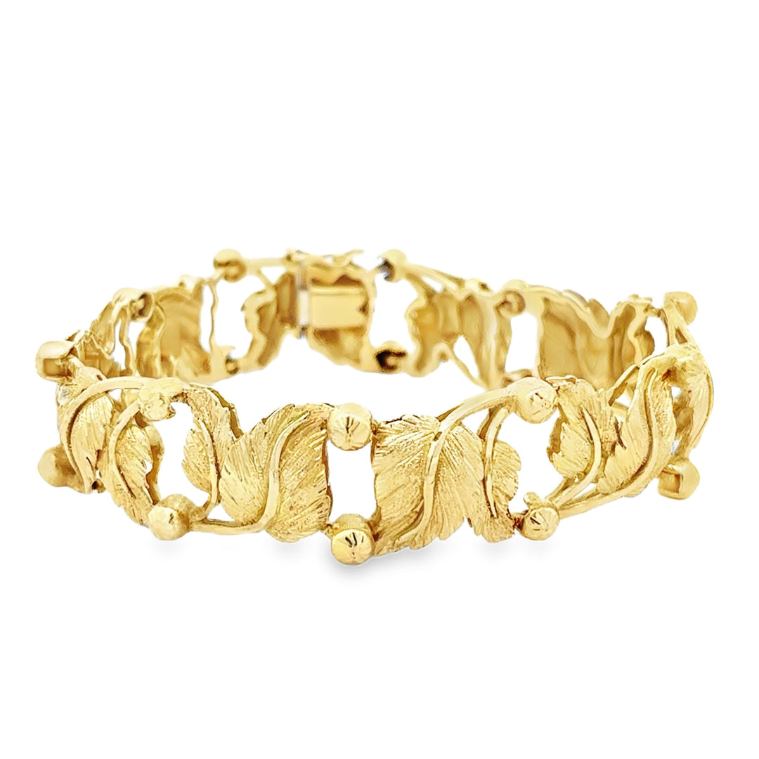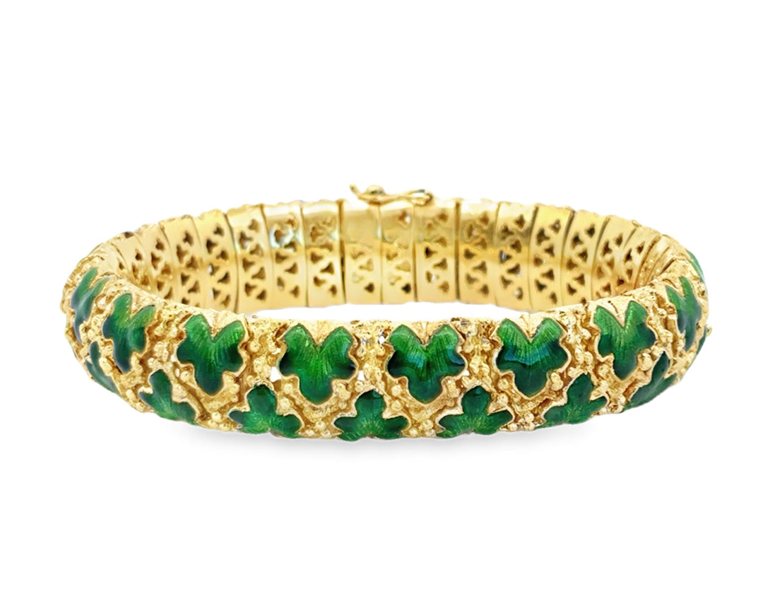 Estate 18kt yellow gold and green enamel leaf bracelet