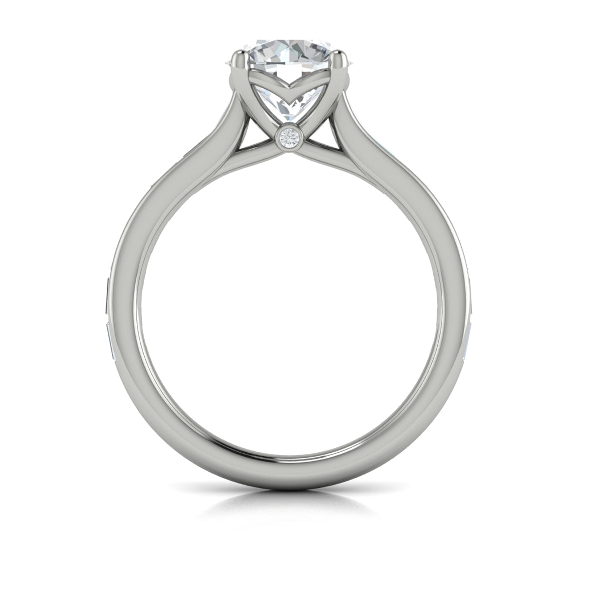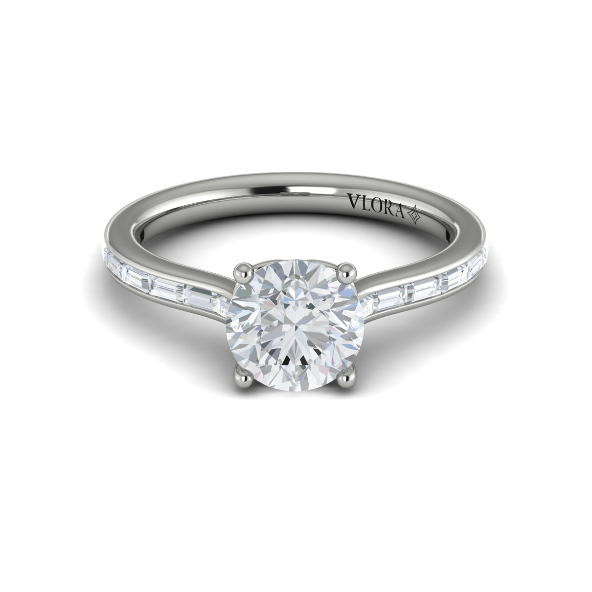 Vlora platinum round diamond engagement ring mounting. This ring features a center four-prong setting for an approximate 1.5-carat round diamond (priced separately), with seven (7) straight baguette diamonds channel-set horizontally down each side of the 2mm polished shank. The sidewalls of the ring are both accented with a single bezel-set round diamond. The fourteen (14) baguette diamonds have a combined total weight of 0.40 carat, and the two (2) round diamond accents weigh 0.01 carat total; all are F to G in color and VS in clarity.