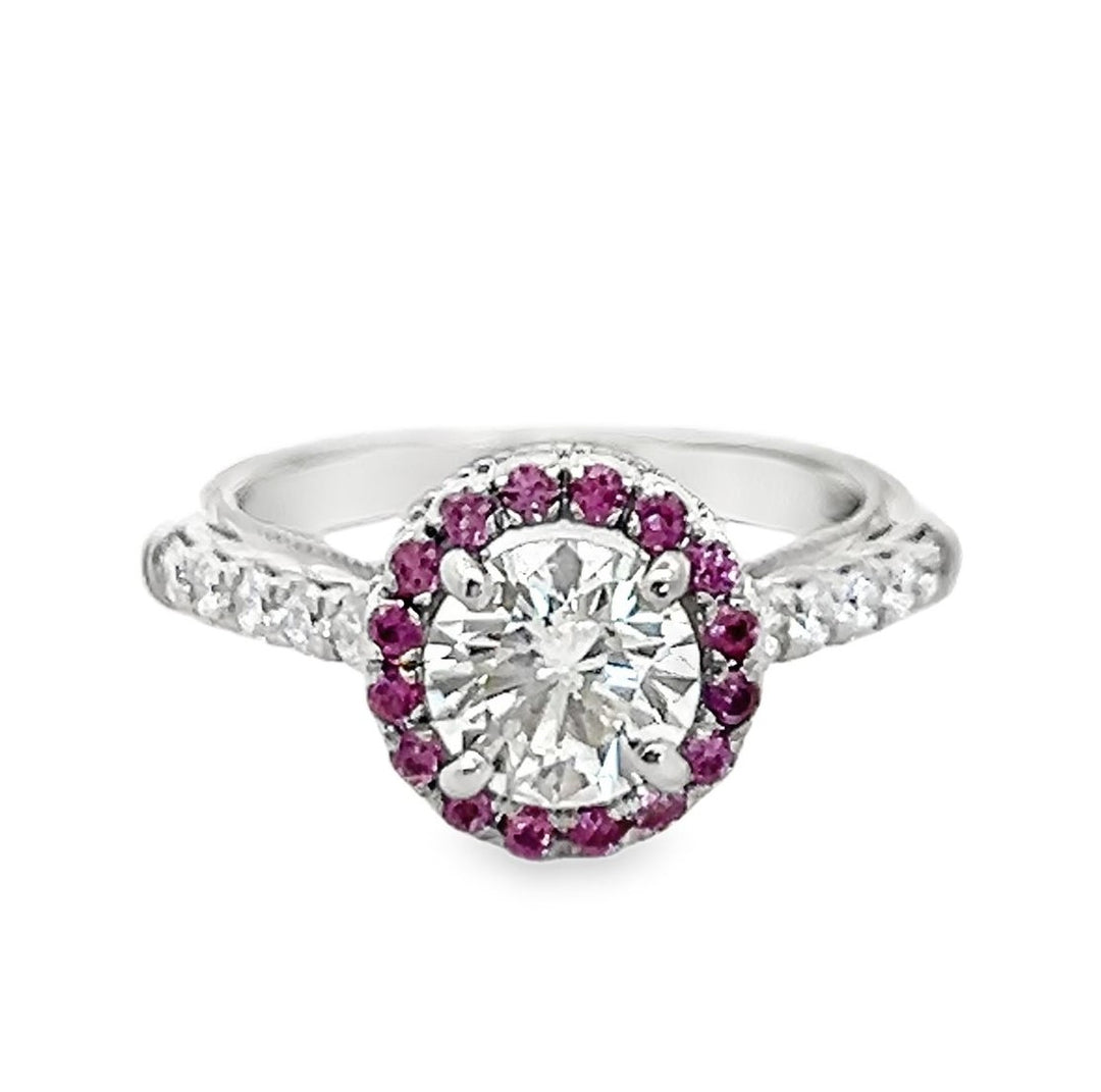 Estate Verragio platinum diamond and pink sapphire halo engagement ring