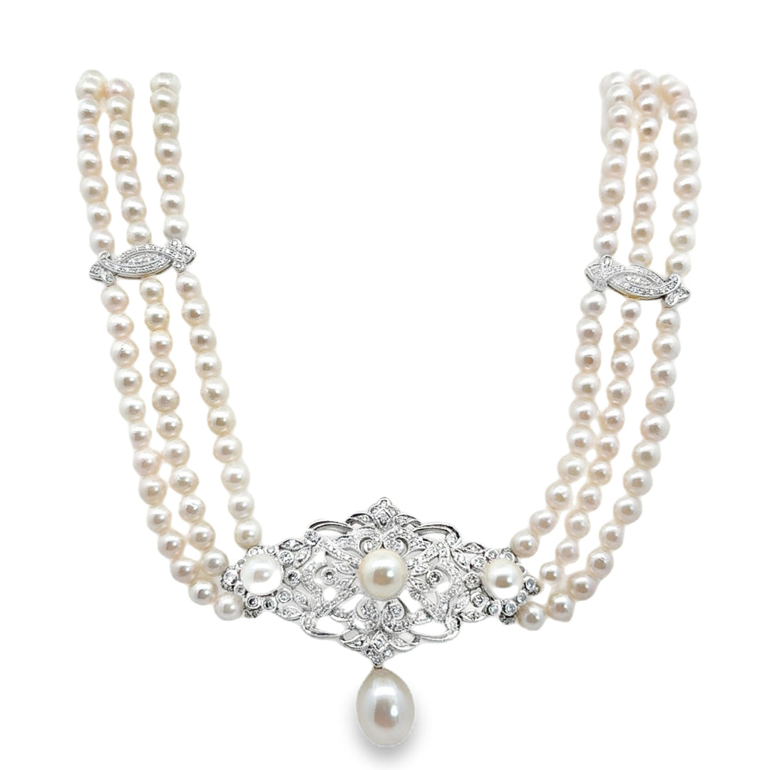 Estate 18kt white gold pearl and diamond triple strand choker necklace