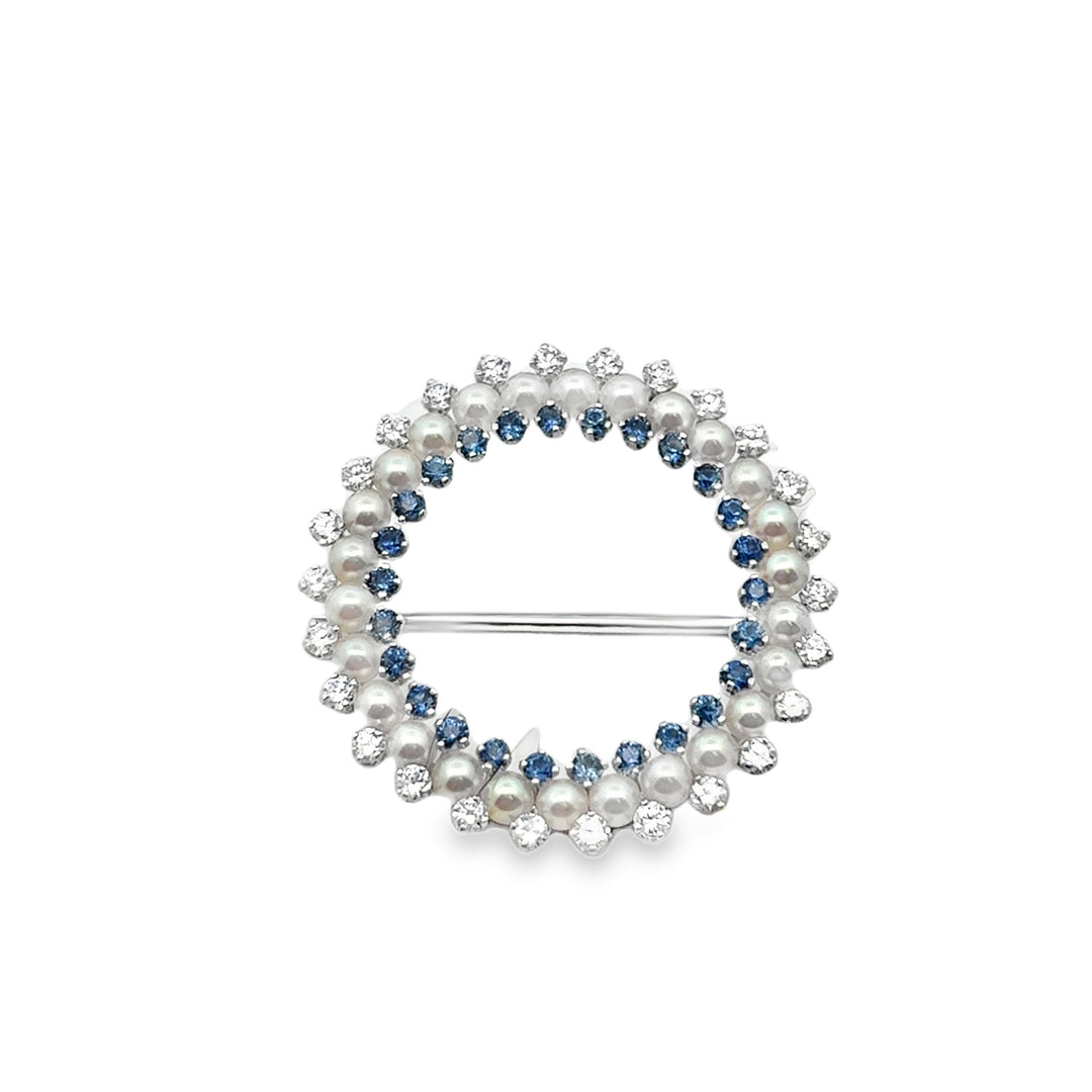 Estate Mid-Century 14kt white gold sapphire, pearl, and diamond circle brooch