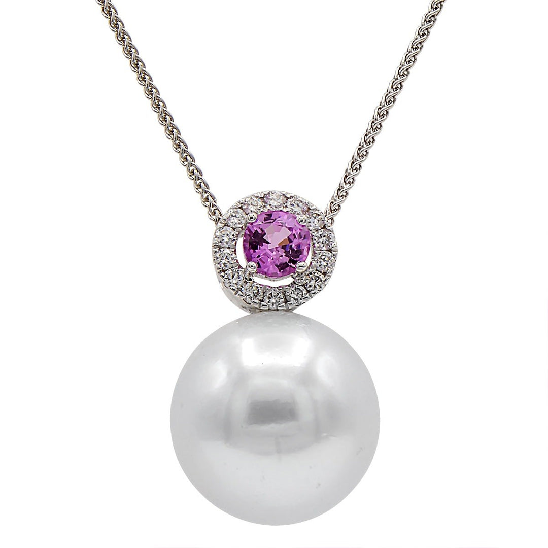 18kt white gold South Sea pearl, pink sapphire, and diamond pendant necklace