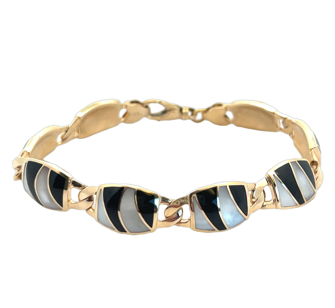 Estate 14kt yellow gold onyx and mother of pearl inlay bracelet