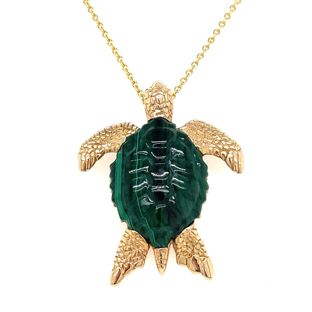 Kabana 14kt yellow gold malachite turtle pendant necklace.