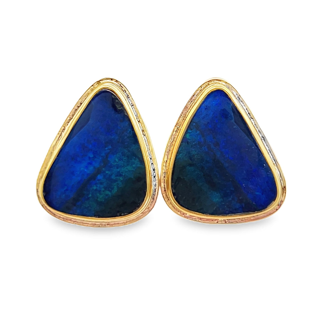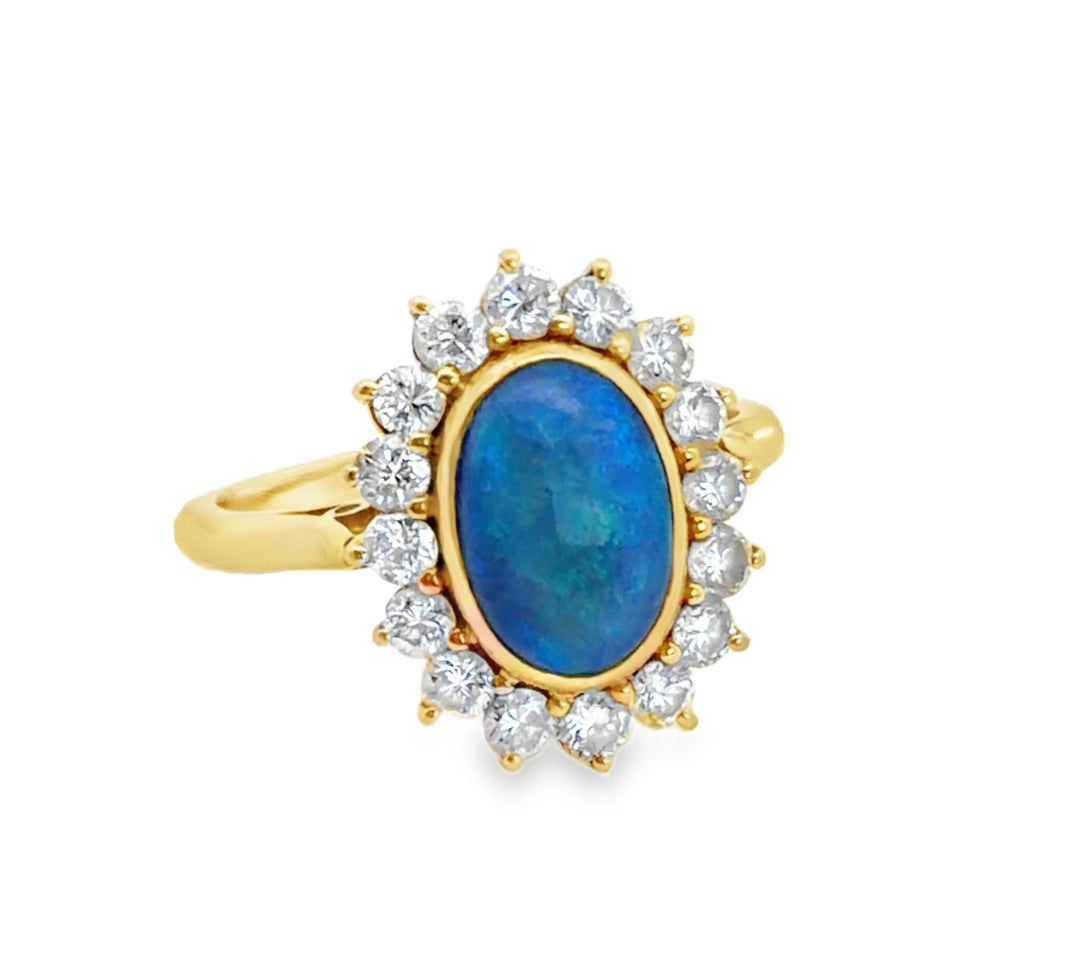 Estate Charles Green & Son 18kt yellow gold boulder opal and diamond halo ring