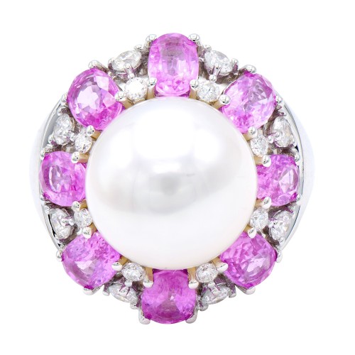 18kt White Gold South Sea Pearl, Pink Sapphire, And Diamond Cocktail Ring