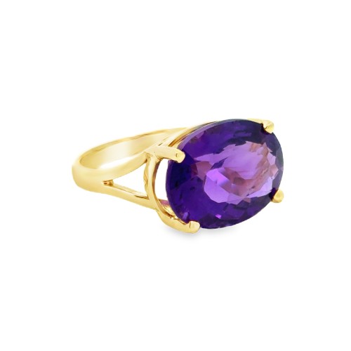Estate 14kt yellow gold amethyst ring. This ring features a single 12mm x 16mm faceted oval amethyst, set sideways in four prongs on a polished split-shank mounting. Ring Size: 6.5 DWT: 3.7
